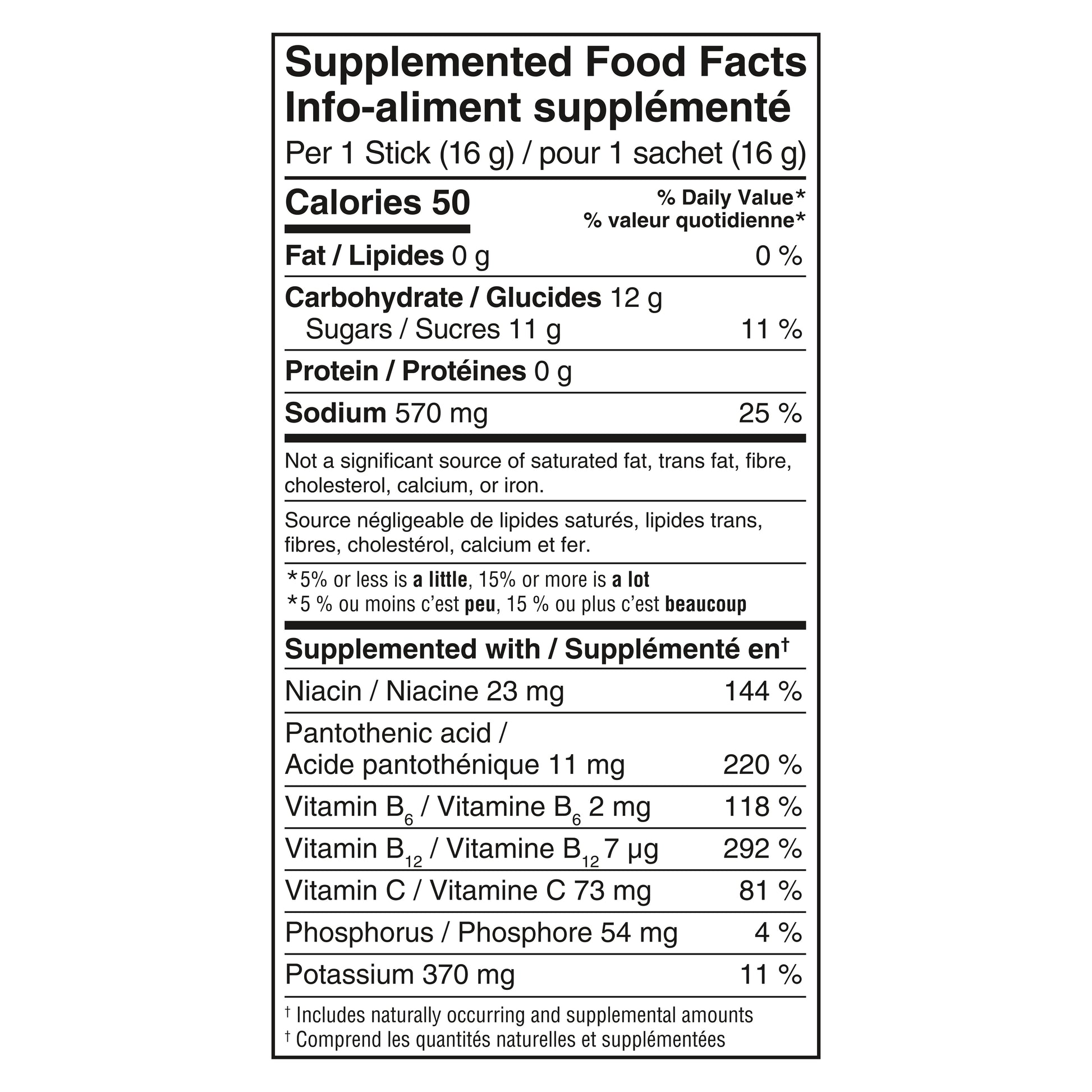 Sugars (pure cane sugar, dextrose), Citric acid, Salt, Potassium citrate, Sodium citrate, Natural flavours, Potassium phosphate, dibasic, Silicon dioxide, Rebiana (Stevia leaf extract), Ascorbic acid (Vitamin C), Niacinamide (Vitamin B3), Pantothenic acid (Vitamin B5), Pyridoxine hydrochloride (Vitamin B6), Cyanocobalamin (Vitamin B12)