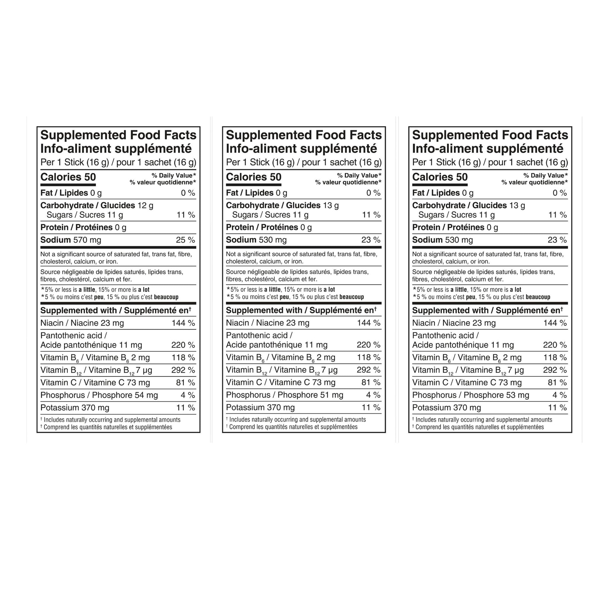 Sugars (pure cane sugar, dextrose), Citric acid, Salt, Potassium citrate, Sodium citrate, Natural flavours, Potassium phosphate, dibasic, Silicon dioxide, Rebiana (Stevia leaf extract), Ascorbic acid (Vitamin C), Niacinamide (Vitamin B3), Pantothenic acid (Vitamin B5), Pyridoxine hydrochloride (Vitamin B6), Cyanocobalamin (Vitamin B12)